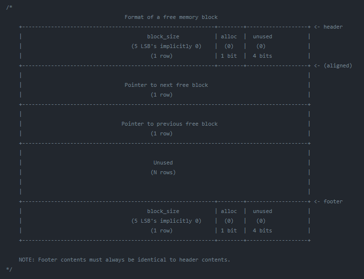 This implementation makes use of segregated free lists which are circularly doubly linked lists. Each list represents a size value range equal to the size of the free block stored in the list.